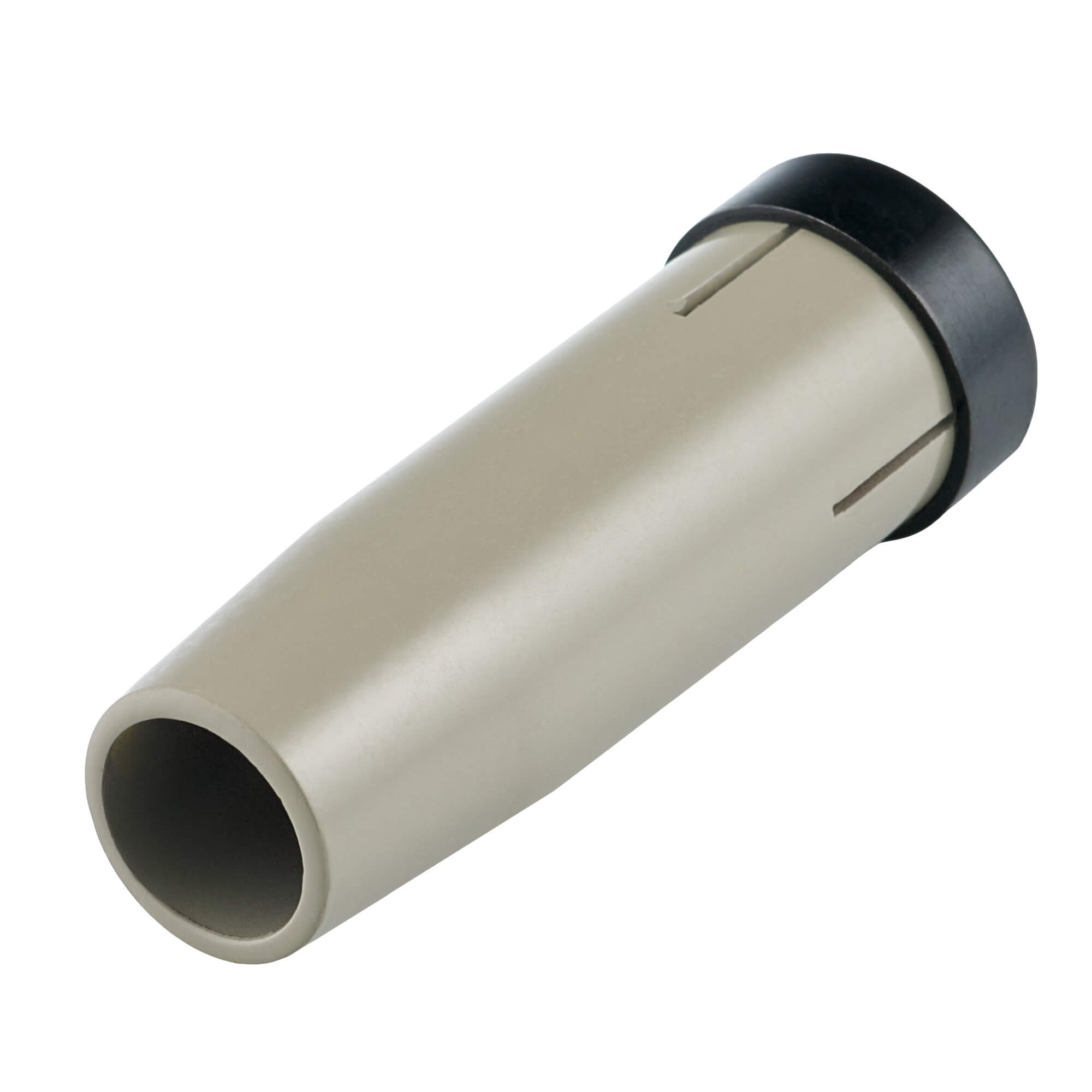 Газораспределительное сопло с керамическим покрытием для полуавтоматических горелок MIG MP 24 и MIG MP 240 всех серий. Выходной внутренний диаметр сопла 12 мм. Сопло используется для равномерного распределения газового потока и для защиты сварочного наконечника от механического воздействия или случайного соприкосновения со свариваемым изделием.Сопло изготовлено из меди, сверху нанесён керамический слой, который работает как электрический и термический изолятор поверхности.Керамическое покрытие наносится специальным технологическим процессом, образуется гомогенный ровный слой, рассчитанный на промышленную эксплуатацию такого газораспределительного сопла. Керамический слой состоит из броннитрида (бор нитрид, BN).Отличительная особенность сопла CRM2412 – это керамическое покрытие:Керамическое покрытие создаёт термобарьер, так как керамика выдерживает очень высокие температуры, не расплавляется и не деформируется.Покрытие препятствует прилипанию сварочных брызг за счёт очень гладкой поверхности. Брызги либо отскакивают, либо слабо держатся и легко счищаются.Из-за отсутствия налипших брызг металла формируется более стабильный газовый поток и дуга. Увеличивается продолжительность работ без остановки и последующей очистки сопла и комплектующих для горелки MIG.Керамический слой заметно увеличивает ресурс сопла и расходных частей сварочной горелки.Область применения сопел с керамическим покрытием:Узкощелевое сваривание труб, толстых стенок. Орбитальная сварка, где сопло или наконечник может задеть стенку свариваемого изделия. В таком случае керамическое покрытие выступает в роли диэлектрика, защищает от коротких замыканий, снижает риск «поджигания» дуги по боковой стенке и медных включений в металл шва.Сварка порошковой проволокой, где нужно увеличить токи и скорость без потери качества корня.Автоматизированные линии и роботизация, где критичны длительные остановки рабочего процесса и присутствует минимальное обслуживание сварочных горелок.